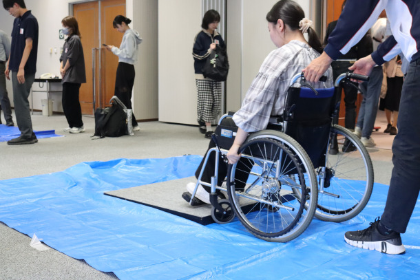 続いて参加者を「視覚障がい編」「車いす編」の2班に分けて、講義と実技体験を行いました。70分ずつで班を入れ替え、両編を全てご参加いただきました。