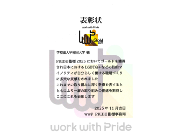 2025年11月14日、早稲田大学のLGBTQ+に関する取り組みが、一般社団法人「work with Pride」が策定する職場における評価指標「PRIDE指標2025」において、4年連続「ゴールド認定」を獲得いたしました。