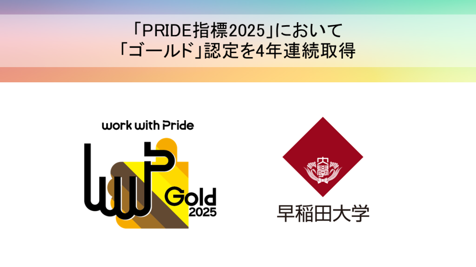 2025年11月14日、早稲田大学のLGBTQ+に関する取り組みが、一般社団法人「work with Pride」が策定する職場における評価指標「PRIDE指標2025」において、4年連続「ゴールド認定」を獲得いたしました。