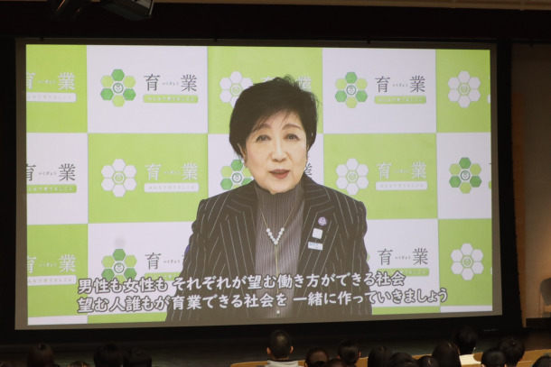 開会にあたり小池百合子東京都知事から寄せられたビデオメッセージが紹介され「’育児休業’という言葉は’休んでいる’という印象を与えかねないがとんでもない。育児は‘お休み’ではなく未来を担う子どもを育てるとても大切な仕事。‘育児休業’のお休みのイメージを変えて育児を社会全体で応援するようマインドチェンジを進めたい」と本イベントの趣旨を説明されました。