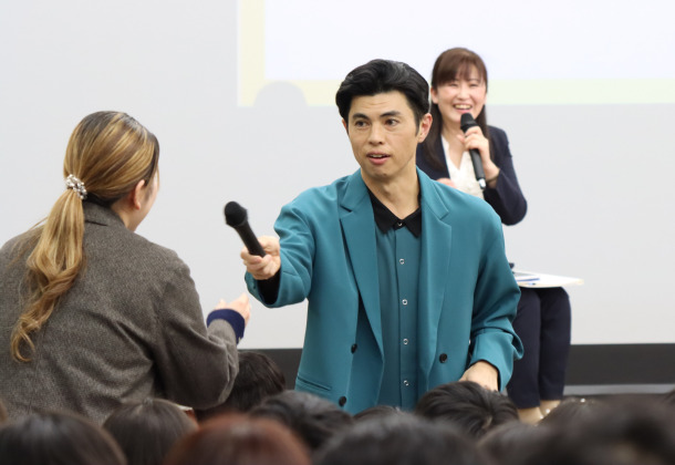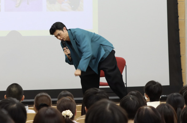▲ 質疑応答の際マイクの不具合により、小島よしお氏自らマイクを持って学生の元に駆けつけてくださいました