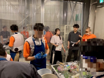 ペットボトル洗浄作業を見学する学生