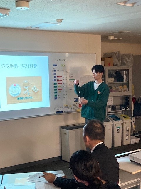 最優秀賞を受賞した「ポラリス20周年記念手ぬぐいの製作」について企画提案を行う学生