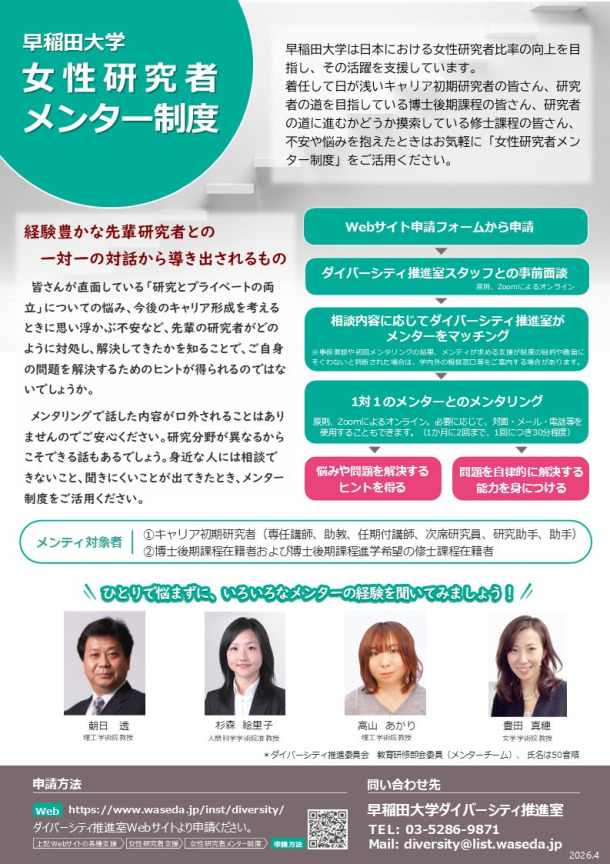 着任して日が浅いキャリア初期研究者の皆さん、研究者の道を目指している博士後期課程の皆さん、研究者の道に進むかどうか摸索している修士課程の皆さん、不安や悩みを抱えたときはお気軽に「女性研究者メンター制度」をご活用ください。