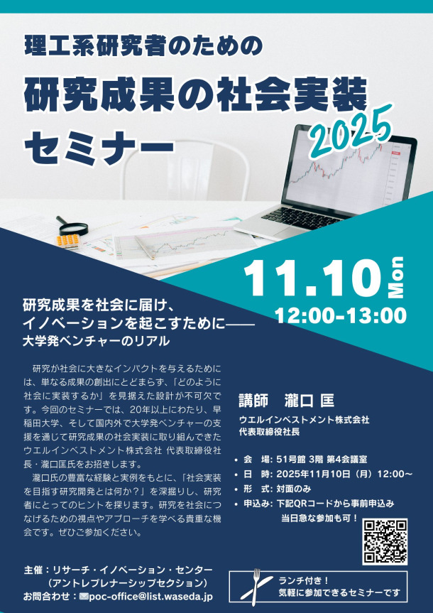 今回のセミナーでは、20年以上にわたり、早稲田大学、そして国内外で大学発ベンチャーの支援を通じて研究成果の社会実装に取り組んできたウエルインベストメント株式会社 代表取締役社長・瀧口匡氏をお招きします。