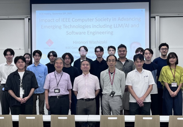 今回は、機構のグローバルソフトウェアエンジニアリング研究所所長であり、今年度IEEE Computer Societyの会長に就任された鷲崎弘宜教授より、「Impact of IEEE Computer Society in Advancing Technologies, including LLM/AI and Software Engineering」と題してIEEE Computer Societyの活動のご紹介、およびLLM/AIとソフトウェア工学に関する最新のご研究に関するご講演をいただきました。