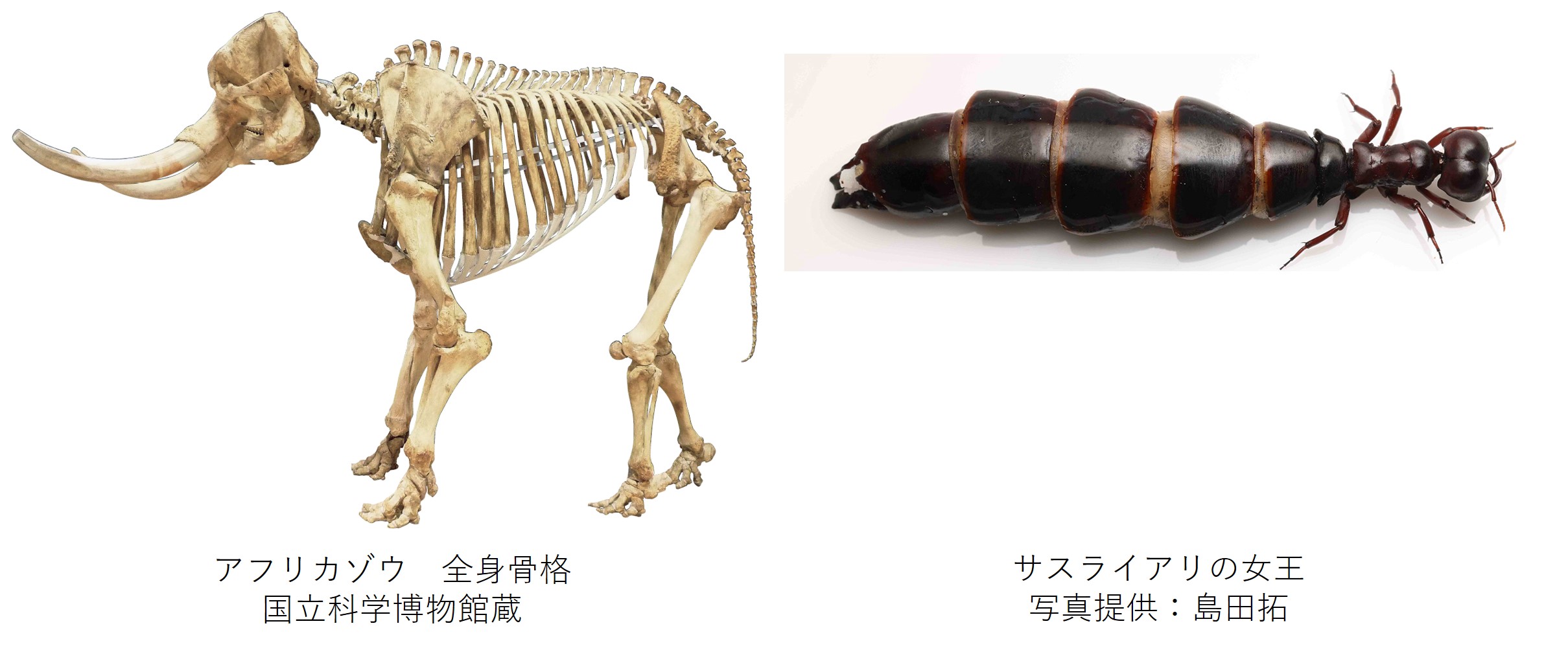 サスライアリは、数千万匹という圧倒的な大群で移動し、獲物を食い尽くす生態で知られています。その中心に君臨する「女王アリ」は、これまで国内外の研究者が長年調査を続けても、その姿を確認することすら極めて困難な“生きる伝説”とされてきました。しかし、本展の昆虫展示を監修する九州大学総合研究博物館准教授の丸山宗利氏と、30年以上にわたりアリの研究に人生を捧げてきた“アリマスター”島田拓氏がアフリカ・ケニア共和国ケニア山のふもとで調査を実施。数千万匹のアリに守られた巣の奥で、初めて「サスライアリの女王」との遭遇・撮影に遂に成功しました。体長は5cmを超え、黒く光沢を放つ腹部には卵が詰まり、1日に数千個を産むとされています。また、寿命は30年近くにも及ぶと言われ、まさに“アリの頂点”と呼ぶにふさわしい存在です。本展覧会では世界でも数少ない幻の女王アリの標本の一つを日本初展示します。