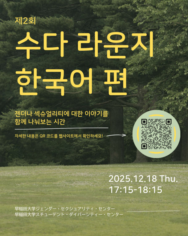 와세다대학교의 LGBTQ+ 학생, 그리고 젠더·섹슈얼리티에 관심 있는 모든 사람들을 위한 공간입니다. 누구나 자유롭게 이용할 수 있는 세이퍼 스페이스/리소스 센터입니다.