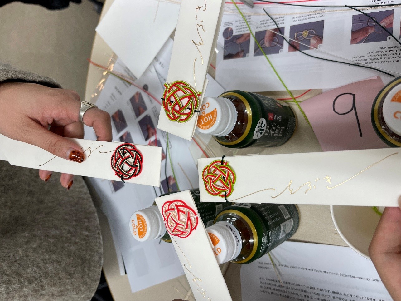 The workshop’s focus was on celebrating New Year as we were getting closer to the end of 2025. The colors that the master brought are common to celebrate New Year. Our focus was to make a self-standing Plum Knot for celebratory chopsticks! The master talked about the relationship between humans and “kami”,the deities, in mundane things like chopsticks, food, and offerings. We were then introduced to how Japanese celebrate New Year: through festivals and events like Tori no Ichi, Niiname-sai, The Setagaya Boro-ichi, Hagoita-Fair,… I was thrilled to know about these events as I plan to explore Japan during the winter break!