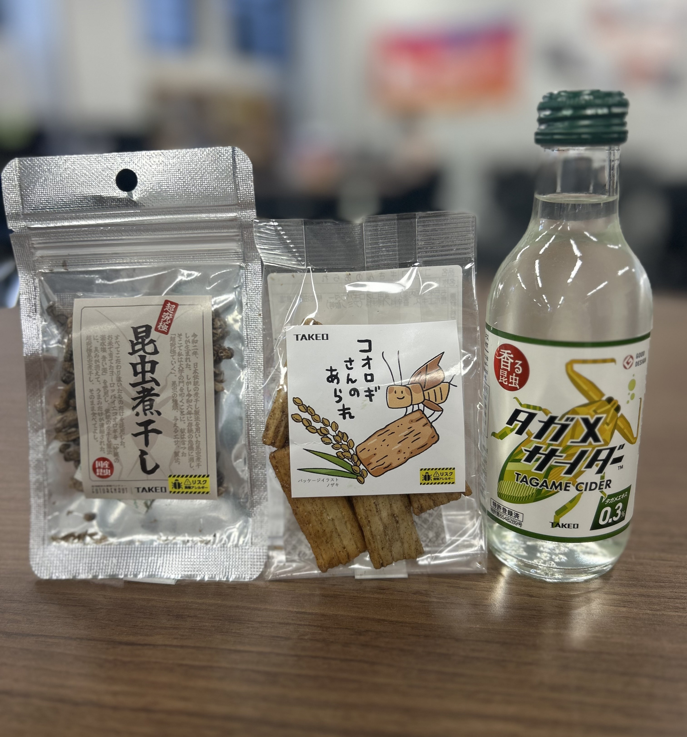 今回の試食品には、「コオロギの煮干し」「コオロギのあられ」「タガメサイダー」の3種を用意しました。昆虫食と聞くと抵抗感のある人も多いかもしれませんが、参加者の皆さんが美味しいと言って食べている姿がとても印象的でした。