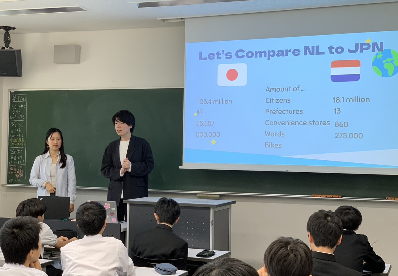 本番は、単なる「講義」にしたくなかったので、私たちの授業は、クイズで挙手を求めたり、映像で文化を紹介したり、簡単な会話練習などを中心に構成しました。しかし、授業当日の私たちの最大の心配点は、生徒が積極的に挙手や発言をしてくれるのかという点でした。しかしそれは要らぬ心配でした。生徒はみな、ちょっとしたことに対してもリアクションをしてくれて、双方向の活発な授業をすることができました。本プログラムは、中学1年生の「授業」を担当するものでしたが、そうした活発な双方のやり取りだったため、授業というよりも、「交流」に近い雰囲気で行うことが出来ました。また、今回訪問する学校は、男子校だったのですが、それが彼女にとっては驚きだったそうです。オランダでは、ほとん