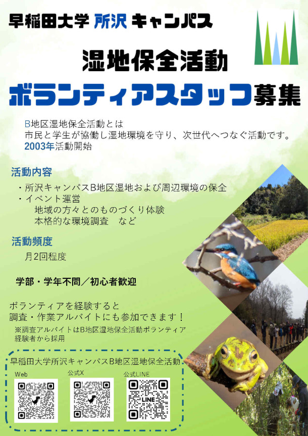 早稲田大学(主に所沢キャンパス)の学生が中心となり、市民の方々と共に作業、調査、散策などの活動を月に一度行っています。早稲田大学の学生、大学関係者、他大生、地元の方々、遠方から来てくださる方々等、様々な方にご参加いただいています。また、作業の必要性や湿地の生きものを知って頂くために、野外に出る前に教室で30分ほど講義をしてから湿地に出発します。