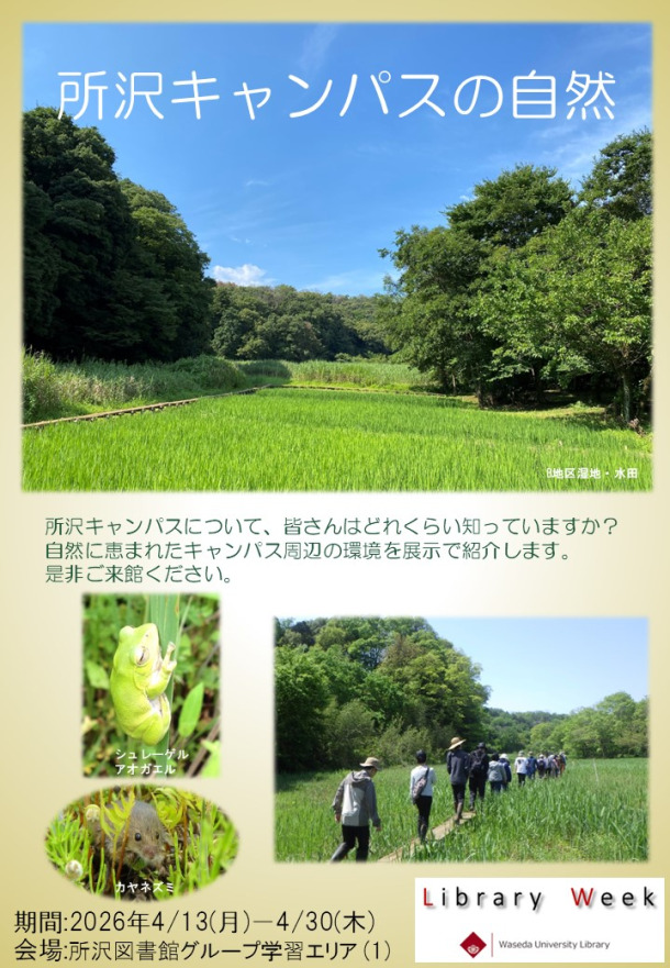 図書館の新入生歓迎イベント「2026年春 Library Week」で、四季折々の自然に恵まれた所沢キャンパスの環境を展示で紹介しています。