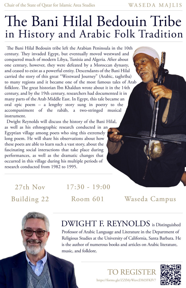 Dwight Reynolds will discuss the history of the Bani Hilal, as well as his ethnographic research conducted in an Egyptian village among poets who sing this extremely long poem. He will share his observations about how these poets are able to learn such a vast story, about the fascinating social interactions that take place during performances, as well as the dramatic changes that occurred in this village during his multiple periods of research conducted from 1982 to 1995.