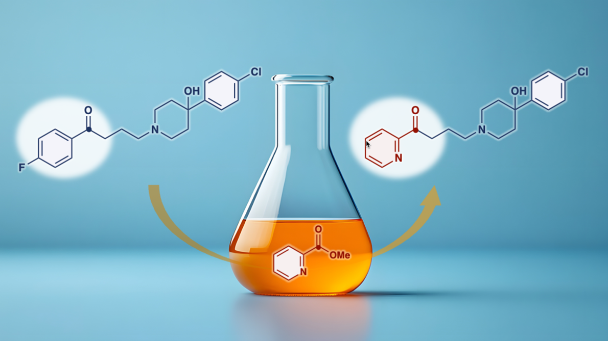 今回、私たちの研究グループは、芳香族ケトンとヘテロ芳香族エステルを一度の反応で混ぜ合わせ、芳香族環を様々なヘテロ芳香環に置き換える新しい「ヘテロ芳香環スワッピング」を開発しました。この反応は、古典的なClaisen反応と逆Claisen反応を組み合わせたもので、容易に入手できる試薬と、温和な条件下で高効率に進行します。これにより、従来は多段階を必要とした変換を、ワンステップで実現することが可能になりました。さらに、この手法は官能基耐性※6が高く、医薬品や天然物など複雑な分子にも適用できることを実証しました。例えば、抗精神病薬である芳香族ケトン「ハロペリドール」の芳香環をワンステップで、ピリジン環をもつ新規類縁体へと変換可能です。ピリジン環のみならず25種類以上のヘテロ芳香環に変換できることもわかっています。