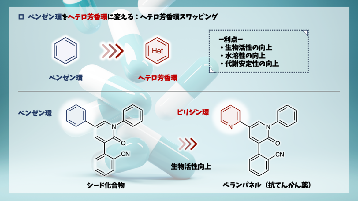 製薬企業の創薬研究者は、薬の性能を向上させるために、生物活性をもつ化合物(シード化合物)を有機合成化学の手法で改変し、より高活性で代謝安定性の高い薬へと作り直してきました。その中でも、芳香環(ベンゼン環)を、窒素などを含む大きさの近いヘテロ芳香環に置き換えると、水溶性や代謝安定性が改善されることが知られています。実際に、抗てんかん薬ペランパネルは、シード化合物のベンゼン環をピリジン環に変えることで、生物活性が約3倍向上しました。