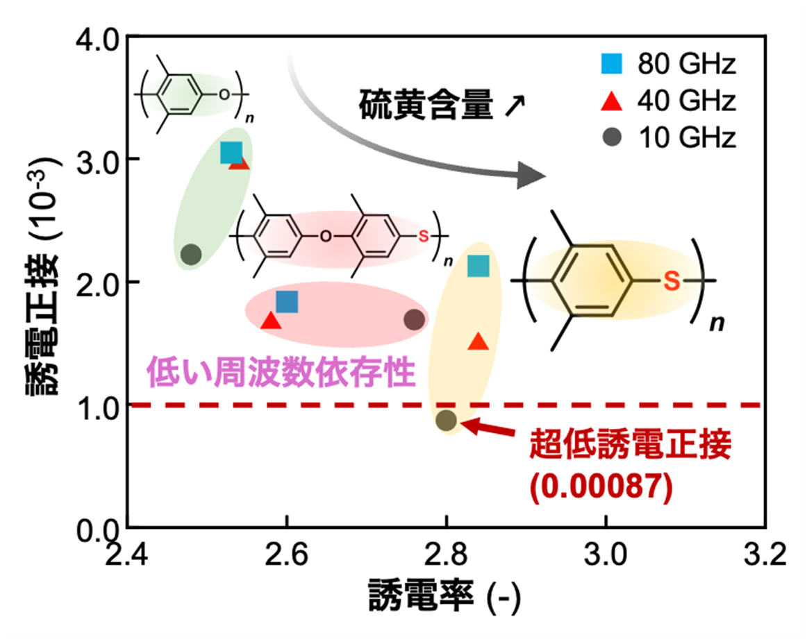 • 硫黄原子と酸素原子を交互に配列する分子設計にも拡張し、170 GHzというミリ波帯でも低誘電特性を維持できることを実証した。