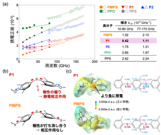 さらに、PPO骨格とPMPS骨格を交互に配置したP1は、他の高分子と異なり周波数が増加しても誘電正接がほぼ変化せず、80 GHzにおいても安定して0.002未満の低誘電正接を維持しました。また、この低い周波数依存性は170 GHzという更に高い周波数帯でも維持されました (図2a)。詳細な機構を調べると、PMPS骨格とPPO骨格が交互に並ぶP1でのみ極性が微小に偏り、高分子鎖間に静電相互作用※15が発現することで電気信号に伴う分子運動が抑制され、幅広い周波数帯においてエネルギー損失を抑えられることが分かりました (図2b, c)。