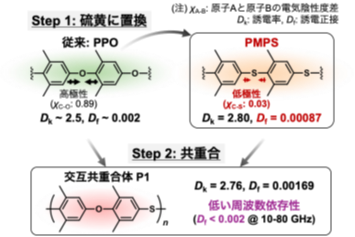 そこで、研究グループは、従来の低誘電材料であるPPOの酸素原子を硫黄に置換したジメチル置換PPS (PMPS) と、これらの交互共重合体※13 P1に新しく着目しました (図1)。
