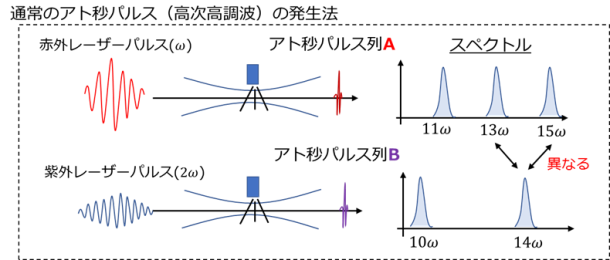 アト秒レーザーパルス列は、高強度のレーザーパルス(基本波)を希ガスなどに集光することによって発生する。このとき、基本波の奇数分の1の波長(11分の1、13分の1など)の高調波が発生し、これを高次高調波と呼ぶ(図4)。例えば、赤外レーザーパルス(ω)によって第11次高調波(11ω)や第13次高調波(13ω)などが発生し、紫外レーザーパルス2ωを用いた場合には、第7次高調波(2ω  7 = 14ω)などが発生する。高次高調波のパルス幅はアト秒になり、極端紫外から軟X線領域の波長をもつ。