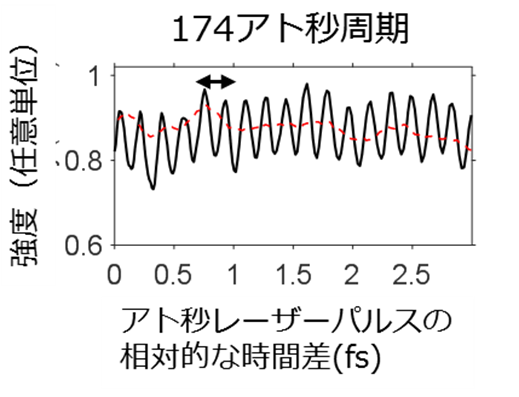 • 極端紫外領域の2つのアト秒レーザーパルスを用いて、ヘリウム原子の電子波動関数の位相が174アト秒周期で振動する様子を測定しました。