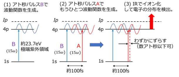本研究では新たに、簡単な光学系を用いた、2つのアト秒レーザーパルスによる電子波動関数の干渉測定法を開発しました。