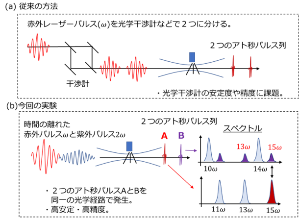 図2.(a)従来の方法。赤外レーザーパルスを2つにわけて、2つのアト秒レーザーパルスを発生させる。(発生したアト秒パルスを2つに分ける方法もある)。(b)今回の方法。赤外レーザーパルス(ω)と紫外レーザーパルス(2ω)を時間的に離し、2つのアト秒パルスを同じ光学系路上で発生させる。このとき、通常のアト秒パルス発生の原理とは異なり、14ωの両端に13ω, 15ωという“余分の”高調波が発生する。この余分の高調波を測定に利用する。