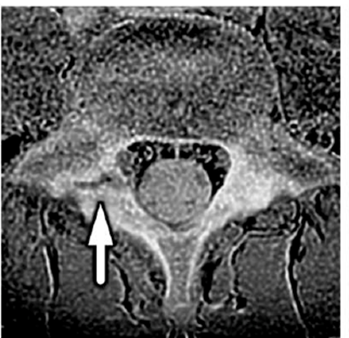 図2: 腰椎分離症のMR画像(画像は腰椎の水平断面を示す。矢印は腰椎分離症の病態箇所である)
