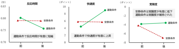 図3:反応時間・快適度・覚醒度の前後比較(安静条件・運動条件)