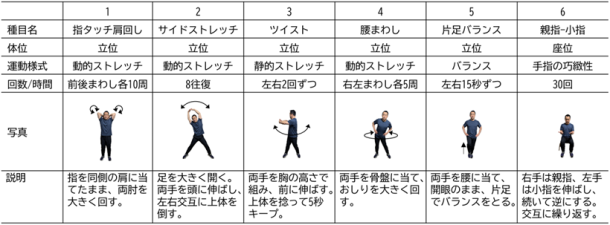 - 実験で用いた3分30秒の低強度運動プログラムは、ストレッチ・片足バランス・手指の運動など、誰もが取り組みやすい種目で構成され、特別な道具や準備は不要で、その場でできる内容でした。この運動プログラムは、同研究グループが前頭前野(大脳の前方にある“脳の司令塔”と呼ばれる領域)の血流を増加させやすい低強度運動種目として、以前の研究(Naito et al., Scientific Reports, 2024)で特定した内容を元に作成しました。