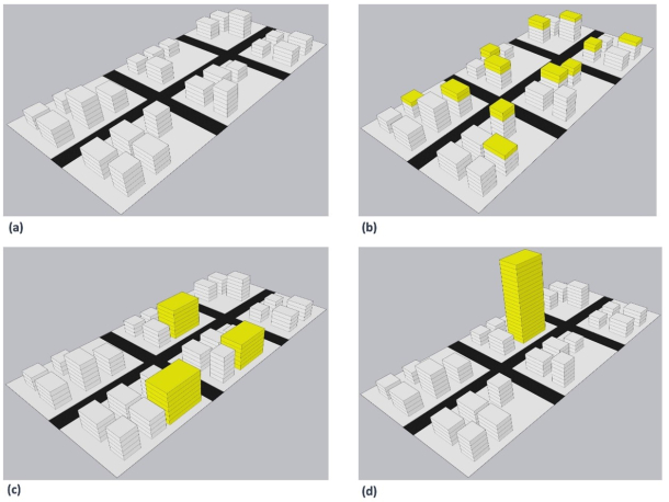 イメージ図. パラメトリック都市デザイン科学と健康 居住密度を20%増加させた、実質的に異なる空間シナリオの例:(a) ベースラインシナリオ、(b) 均等に分布した密度増加シナリオ、(c) 中密度のクラスター型シナリオ、(d) 中心集中型高密度タワーシナリオ