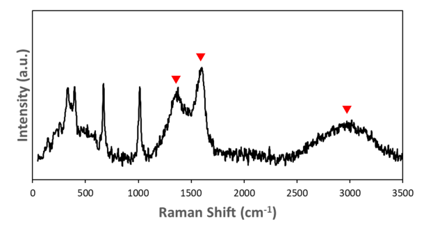 図2 包有物から取得したラマンスペクトル(下向きの赤三角が有機物に由来)