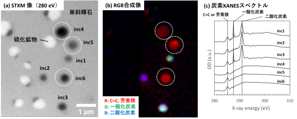 図4 STXMの分析結果。(a) 280 eVのX線の吸収量を示すマップ (b) 芳香族炭素(赤)、一酸化炭素(緑)、二酸化炭素(青)の分布を示すマップ (c) 包有物の部分から得られた炭素(K吸収端)のXANESスペクトル。