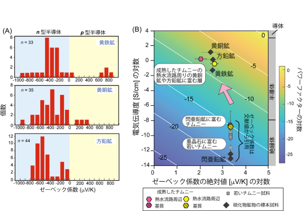 図2. 硫化鉱物とチムニーの電気特性。(A)代表的な硫化鉱物のゼーベック係数。黄鉄鉱、黄銅鉱、方鉛鉱は全て、ゼーベック係数が負の値を持つため、電子をキャリアとするn型半導体であることがわかる。(B)ゼーベック係数の絶対値と電気伝導度の対数プロット。カラー等高線は熱電性能を示すパワーファクターを示している。チムニー形成初期の構成物質(重晶石や閃亜鉛鉱)は電気伝導度が低く、パワーファクターが小さい。チムニーが成熟して、熱水流路周辺に黄銅鉱や方鉛鉱の層ができると電気伝導度が増加し、熱電変換性能が発現することがわかる。
