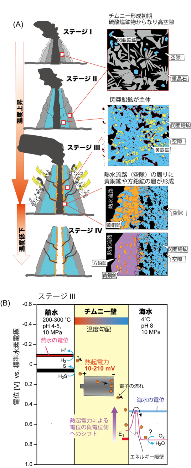 図3. 本研究で示された深海底のチムニーの発達過程と熱起電力による発電現象の仕組み。(A)ステージ I : チムニーの初期過程において硫酸塩鉱物からなる析出物ができる。Sステージ II:チムニー壁が形成され、まず、亜鉛の硫化鉱物が富む。ステージ III:さらに温度が上昇すると、導電性の高い黄鉄鉱や方鉛鉱からなる層が熱水流路周りに形成され、熱起電力による電子の流れが発生する。ステージIV:熱水活動が止まると温度勾配がなくなり熱起電力はゼロに戻る。(B)ステージIIIにおける熱水と海水の電位差と、温度勾配に駆動される発電現象の概略図。還元的な熱水から酸化的な熱水へチムニー壁を介して、熱水側から海水側への電子の流れが発生する。海水側では例えば、酸素が電子を受け取って水に変化する反応が起こると考えられるが、温度差によって発生した熱起電力によって、この反応が進むためには高いエネルギーの障壁を越えて反応を促進させると考えられる。