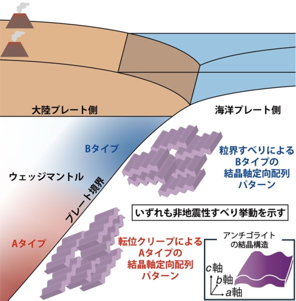上部マントル(ウェッジマントル)に分布する蛇紋岩について、本研究により明らかになった変形の概要図(アンチゴライトの変形機構とつくられる結晶軸の配列パターン)