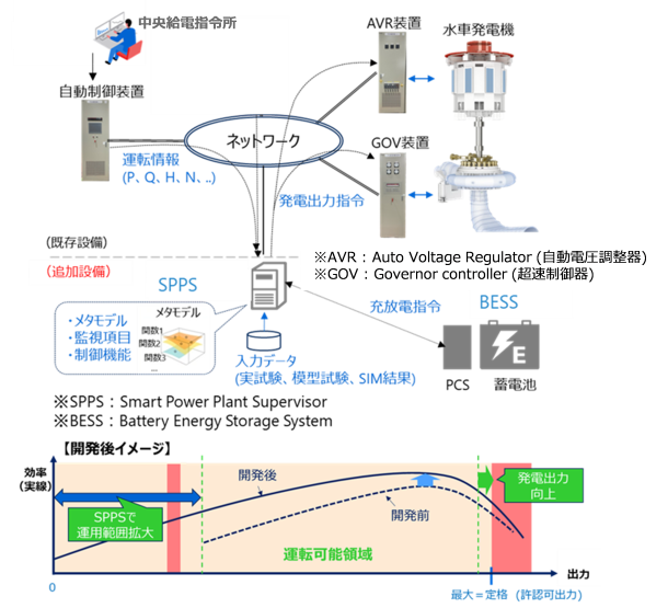 また、今後太陽光発電や風力発電などの増加により高速・高頻度な出力調整が求められ、機器の損耗が進行することが想定されます。そのため、デジタル技術を活用し、水流が不安定となる出力領域での運転状態を把握・監視した上で、損耗が激しくなる領域を特定します。その上で、蓄電池の充放電による補助的な出力調整と組み合わせ、特に摩耗が激しくなる領域での運転を回避することで極低負荷領域での運転を可能とする運用・制御技術(SPPS)を開発します。さらに、この運用・制御システムを用いた水力発電所における実証試験を行い、柔軟性向上に関わる検証を行います。