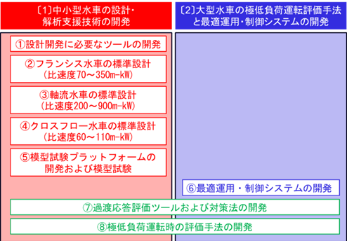 本事業では、これまでの調査結果を踏まえて、水力発電の柔軟性を向上させるための課題を整理し、中小型水車の標準設計に向けた設計・解析支援技術や、大型水車の極低負荷運転時の水車評価手法と最適運用・制御システムの開発などの下記事項に取り組みます。