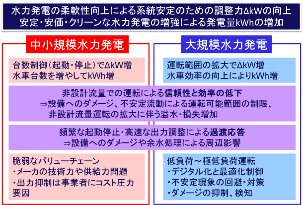 中小型水車は主に起動停止による台数制御での柔軟性向上を目指しますが、水系全体の運用や電力系統の中での発電所の立地を考えると、起動停止による台数制御だけでは出力調整が困難になる場合も想定されるため、大型水車と同様に、極低負荷運転を可能とする対応が必要である場合も考えられます。