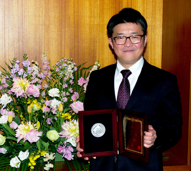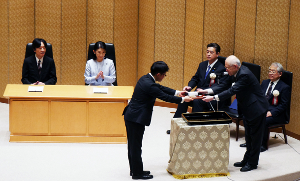 中央:賞状と賞牌を頂く山本教授
