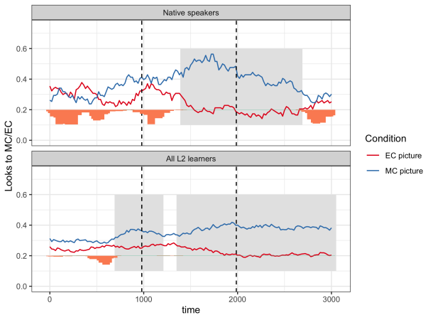 音声を聞いている際の視線の時間的推移。赤線と青線はそれぞれ異なる解釈に対応する絵への注視割合(参加者がどれくらい見ていたか)を示す。ここで MC picture (青線)は主節(「言った」出来事)の場所を表す絵、EC picture (赤線)は従属節(「捕まえた」出来事)の場所を表す絵を示す。上:英語母語話者は早い段階で一つの解釈に視線が集中する傾向があった/下:日本語母語の英語学習者は英語の構造に応じて予測の仕組みを調整していた