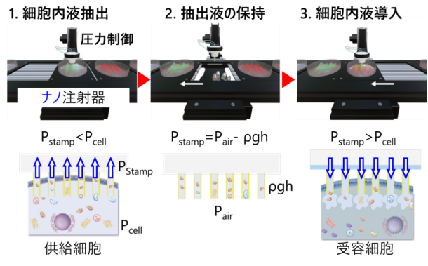 図:圧力制御可能なナノ注射器による細胞内液・ミトコンドリア移送技術