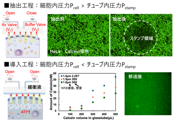 本研究で用いたナノチューブ注射器は、金ナノチューブ膜とガラス管から構成され、ナノチューブを細胞膜に挿入した状態でガラス管内部の圧力を制御することで、細胞内成分の出入りを制御します。ガラス管内の圧力(Pstamp)が細胞内圧(Pcell)より低い場合には、細胞内液が受動的にナノチューブ内へ流入し、細胞内成分の抽出が行われます。一方で、ガラス管内に緩衝液を加えることで内部圧力を調整すると、過剰な抽出を抑制し、細胞機能を維持したまま穏やかな物質交換が可能となります。本研究では、ナノチューブ内径が大きく、かつ、ナノチューブ密度が多いほど、抽出量は大きくなり、一方、ガラス管に加える緩衝液の量を増やすほど、抽出量は少なくなることがわかりました。特に約200μLの緩衝液をガラス管に入れると、抽出はほぼ抑制されることがわかりました。