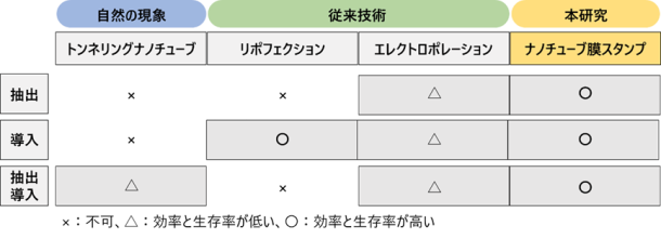本研究では、自然界における偶発的な細胞間輸送(TNT)や、導入のみに特化した既存技術の限界を踏まえ、生細胞から細胞内成分を穏やかに抽出し、別の生細胞へ高効率に導入することを同一プラットフォームで実現するナノ注射器システムを開発しました。本技術は、ナノチューブ内部の圧力を精密に制御することで、抽出・保持・導入という一連の操作を連続的かつ再現性高く行える点に特徴があります。