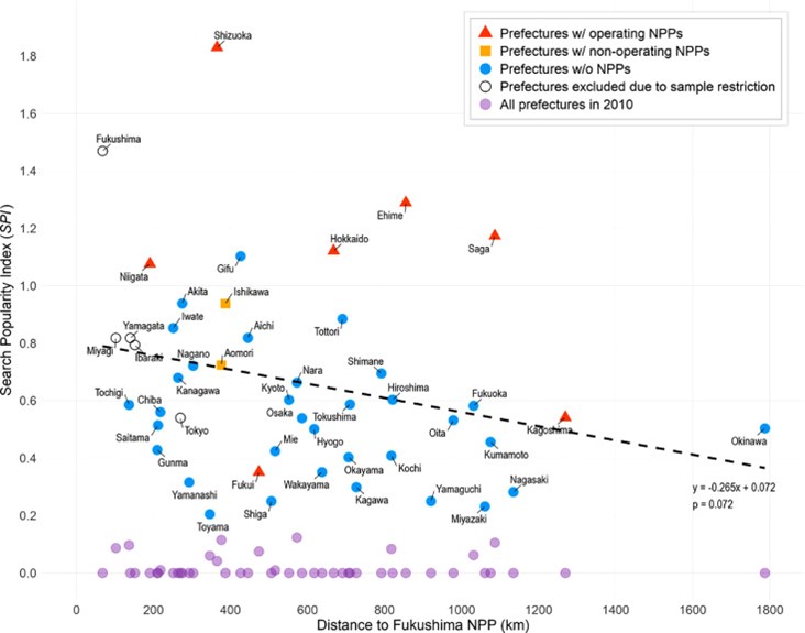 ※図注:各点は都道府県を表す。マーカーは原子力発電所の状況を示しており、赤い三角は運転中の原子力発電所が所在する都道府県、オレンジの四角は停止中の原子力発電所が所在する都道府県、青い円は原子力発電所が所在しない都道府県を示す。黒枠は分析から除外された都道府県を表す。紫色の円は2010年(事故前)の基準値を示す。横軸の距離は福島原子力発電所からの距離(km)である。破線は、福島原発からの距離と2011年(事故後)の放射線不安との関係を示したものであり、両者の間には負の相関が確認される(ρ = −0.265, p = 0.072)。