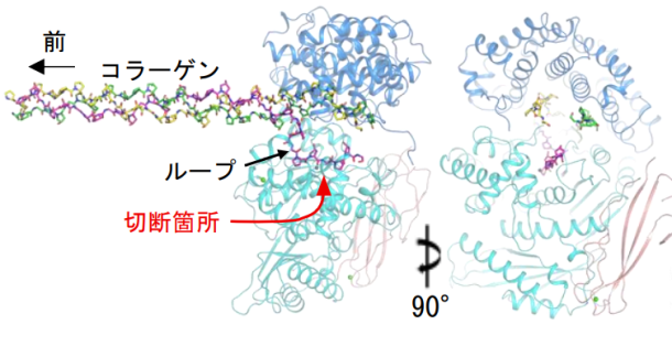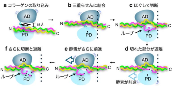 コラーゲンは、細長い三重らせんという特異な形のタンパク質です。細菌が作るコラーゲン分解酵素は、コラーゲンを取り込み、らせんをほぐして切断、その後らせん軸に沿って少しずつ前進し、コラーゲンを細切れにすると考えられます。この仕組みは、ヒトや動物が持つコラーゲン分解酵素が細長いコラーゲンの途中1カ所だけを特異的に切断する仕組みとは根本的に異なっていました。