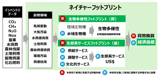 こうした国際的なニーズの高まりを受け、伊坪教授が研究代表を務める研究プロジェクト(研究開発とSociety 5.0との橋渡しプログラム:内閣府BRIDGE)では、日本発の環境影響評価手法「LIME3(Life cycle Impact assessment Method based on Endpoint modeling 3)」をベースとして、企業活動による自然への影響を定量評価・開示するための新指標「ネイチャーフットプリント」の開発を目指しています。本手法の最大の特長は、生物多様性と生態系サービスを網羅的かつ高精度に定量化し、環境負荷を「経済価値」に換算できる点にあります。これにより、ESG投資や企業の経営戦略における意思決定を支える重要なツールとなることが期待されています。