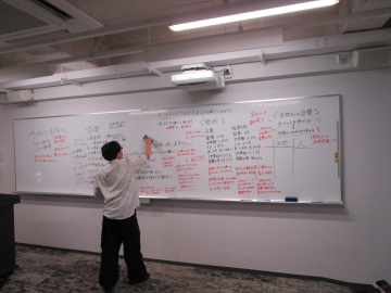 この日は10時~17時という長丁場のグループワークを実施しました。学生だけでのグループワークの日ですが、各チーム1時間事務局の職員も入り、中間相談会に臨むための課題の確認、アイディアの整理などを行いました。なかなかまとまった時間を取って議論する機会が無いので最初は各チームとも遠慮があり戸惑っていましたが、時間の経過とともに議論も活発になり各自のPCや教室のホワイトボードを用いて進めていました。