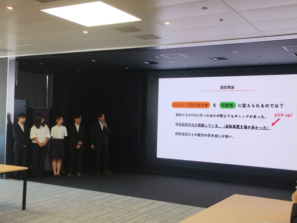 公式回での講義と各チームがこれまで議論してきた内容を踏まえ、実際にどの駅を取り上げて、どのように街を活性化するのかの方向性を発表しました。