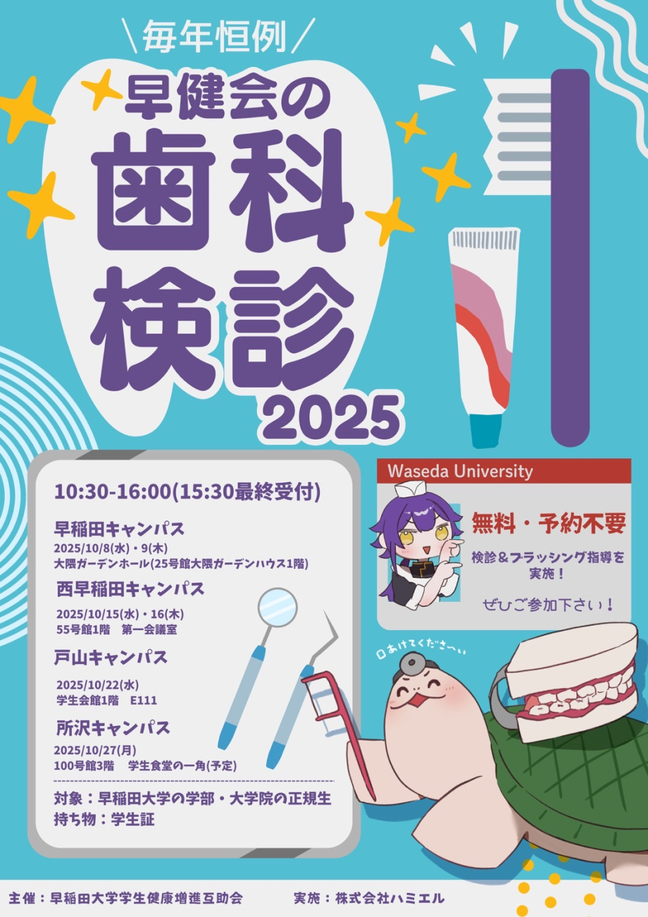 The Waseda University Student Health Promotion Mutual Aid Association will continue to conduct dental checkups at four campuses (Waseda, Nishiwaseda, Toyama, and Tokorozawa) this year.